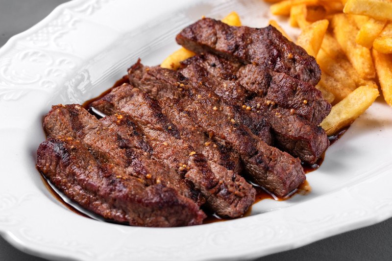 Стейк из мраморной говядины (альтернатива) с соусом демиглас. Подается с картофелем фри и трюфельной пудрой.